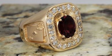Custom gent’s ring created for a poker enthusiast. Red garnet and diamonds set in 14kt yellow gold.