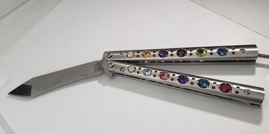 Butterfly Knife with Large Colored Gemstones in the hilt.