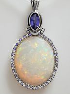This piece was custom made using Tanzanite and an Ethiopian Opal surrounded by Diamonds and set in 14kt white gold.