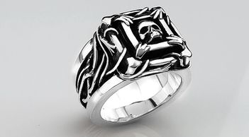 A custom ring loosely modeled after the video game Dark Souls. Made in silver with a black enamel background.