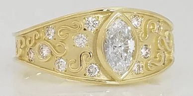 Diamond ring set in 14kt gold with personalized detail work on the finger rail.
