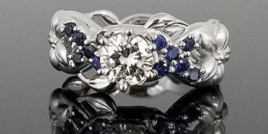 Highly detail incredible engagement ring using diamonds and small sapphire accents. Set in 14kt white and yellow gold.